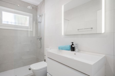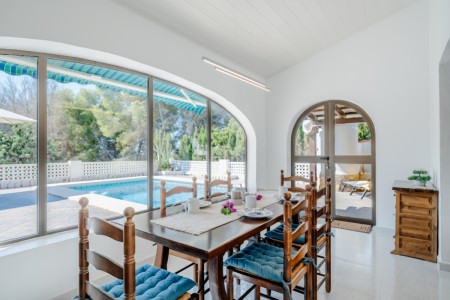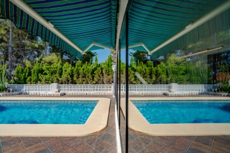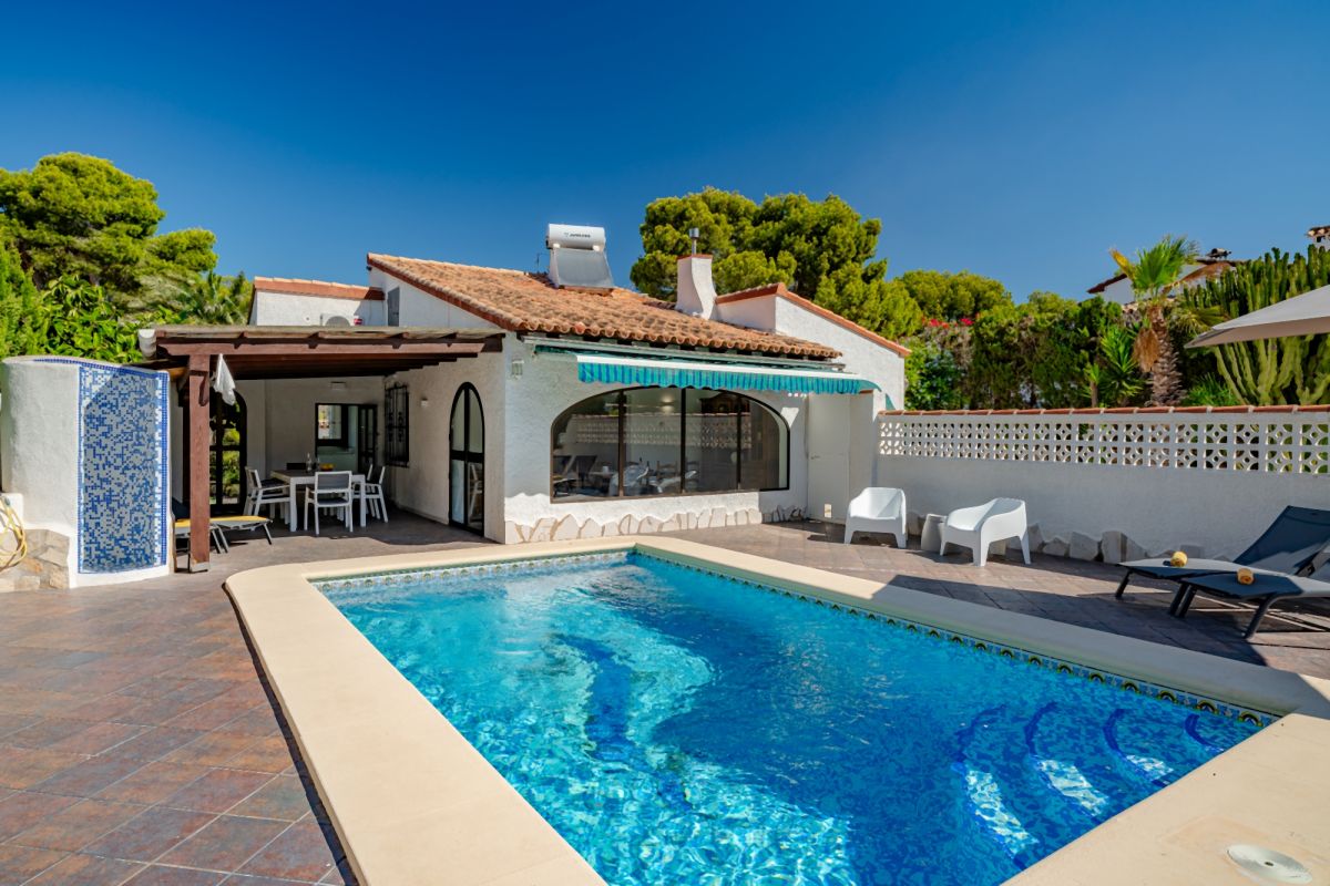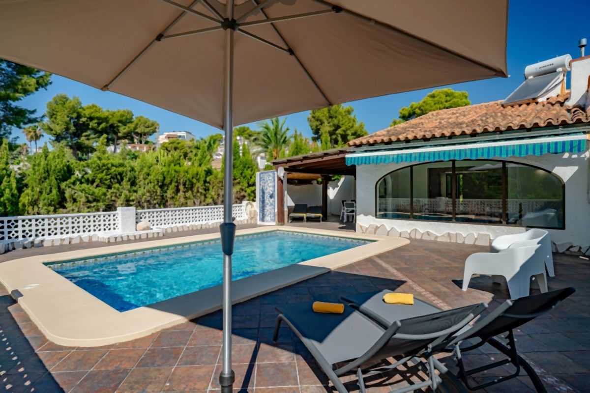 Es gibt 2 Schlafzimmer mit Doppelbett. 1 Schlafzimmer verfügt über 2 Einzelbetten. Alle Schlafzimmer sind mit Klimaanlagen und Einbauschränken ausgestattet. Die beiden Duschbäder sind modern und zweckmäßig. Im Außenbereich befindet sich der 8 x 4 m große Pool mit Poolterrasse und einer überdachten Sitzecke. Ein Carport bietet für 1 Fahrzeug die Parkmöglichkeit auf dem Grundstück, ein weiterer PKW kann auf dem Hof parken.