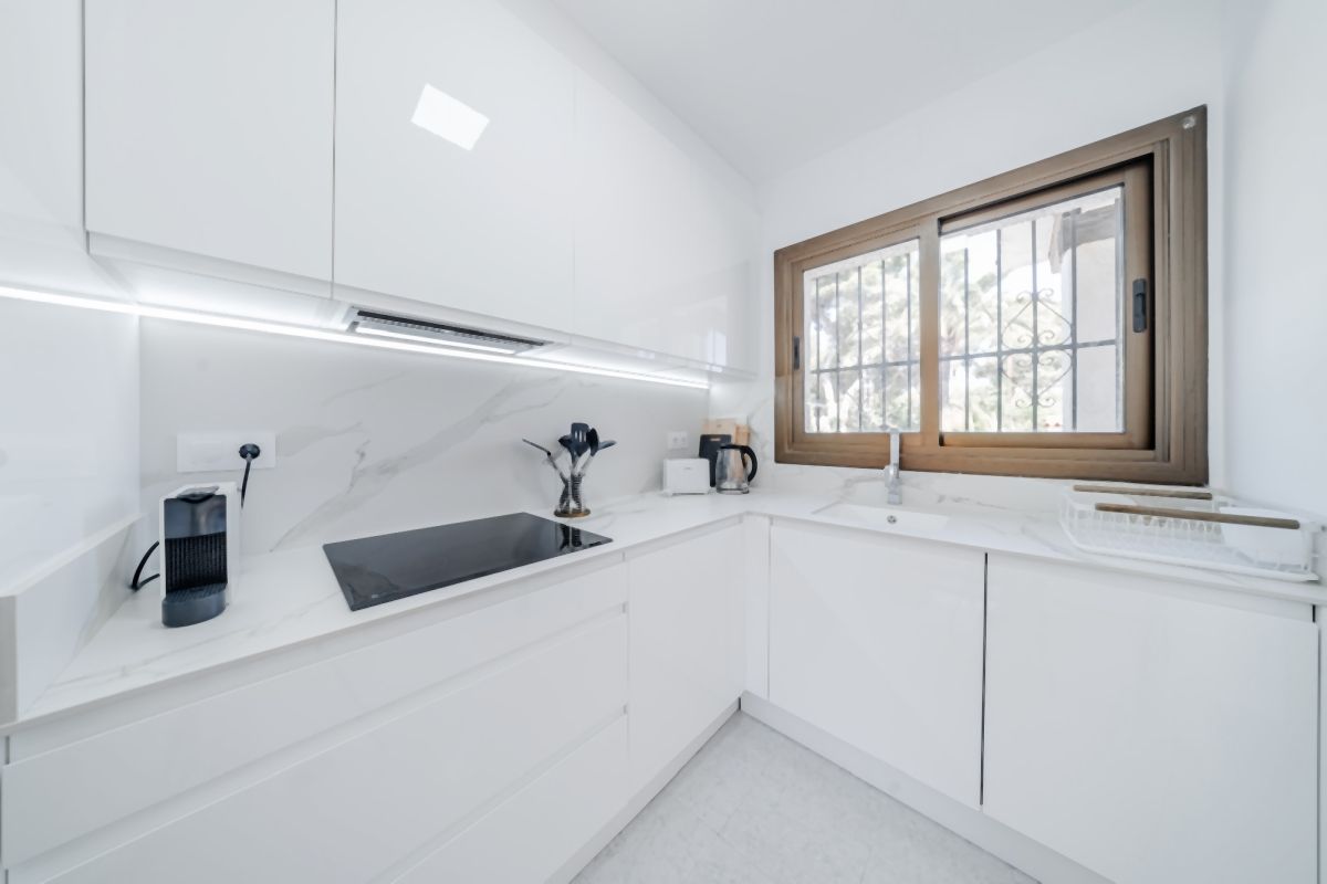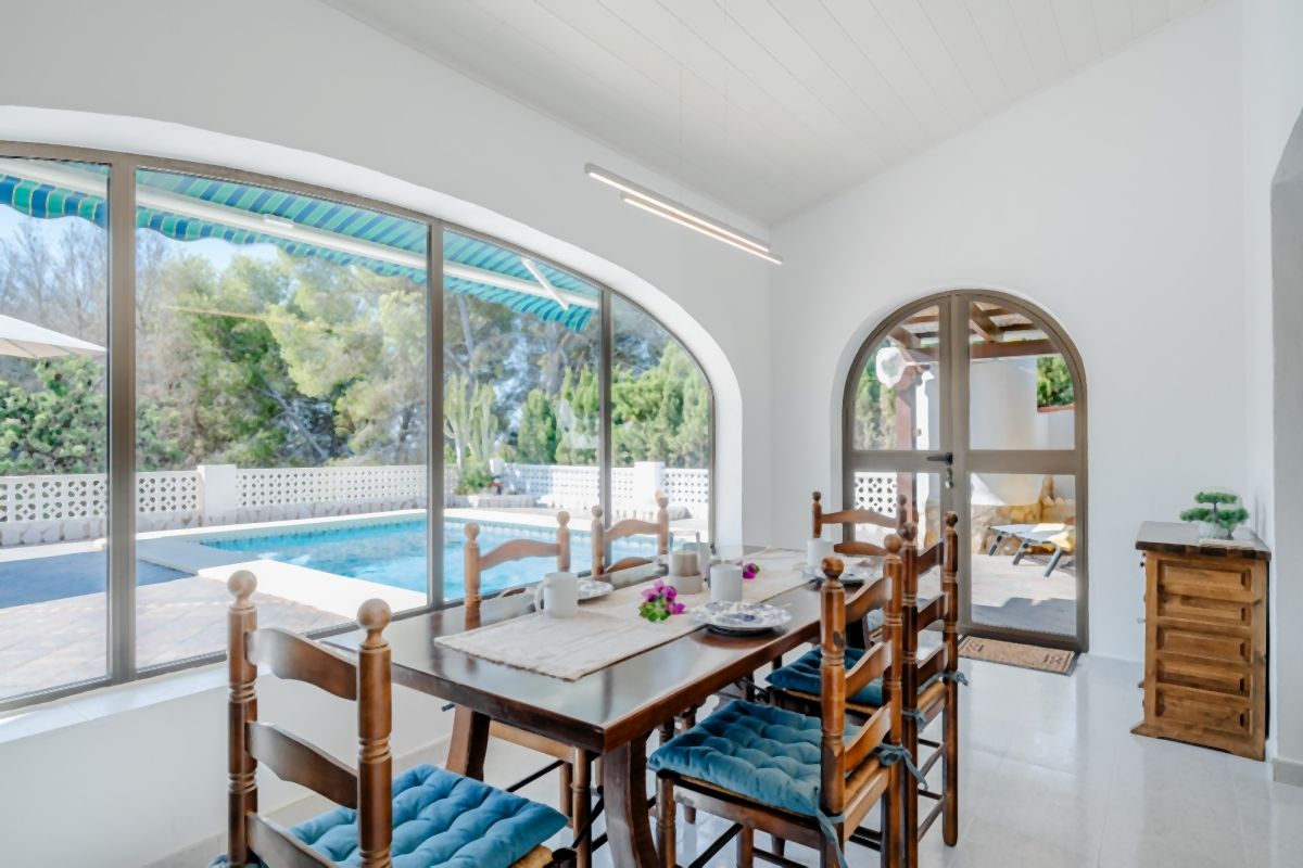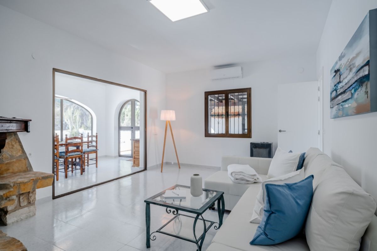 Eine moderne kleine Küche bietet alles, um leckere Mahlzeiten für Familie und Freunde zuzubereiten. Von dort gelangt man auch direkt zur überdachten Terrasse. Das Wohnzimmer mit Kamin ist modern eingerichtet und offen zur Naya hin. Von dort hat man einen schönen Blick auf den Poolbereich.